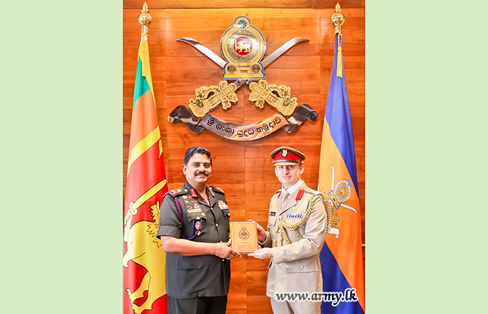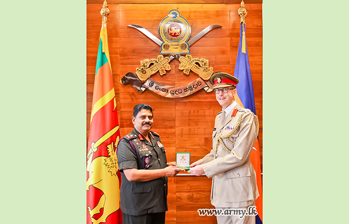 ශ්රී ලංකාව සහ මාලදිවයින සඳහා නවතමයෙන් පත් කරන ලද මෙරට එක්සත් රාජධානියේ තානාපති කාර්යාලයේ ආරක්ෂක උපදේශක කර්නල් කීත් මයිල්ස්, 2025 අගෝස්තු මස 14 දින යුද්ධ හමුදා මූලස්ථානයේදී යුද්ධ හමුදාධිපති ලුතිනන් ජෙනරල් ලසන්ත රොද්රිගෝ RSP ctf-ndu psc IG හමුවිය.