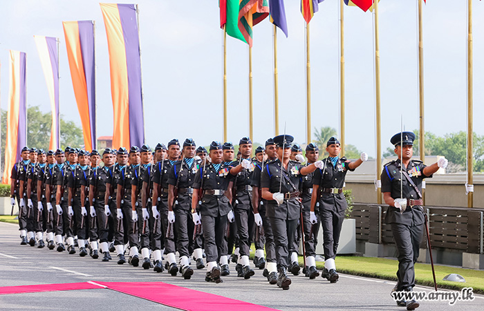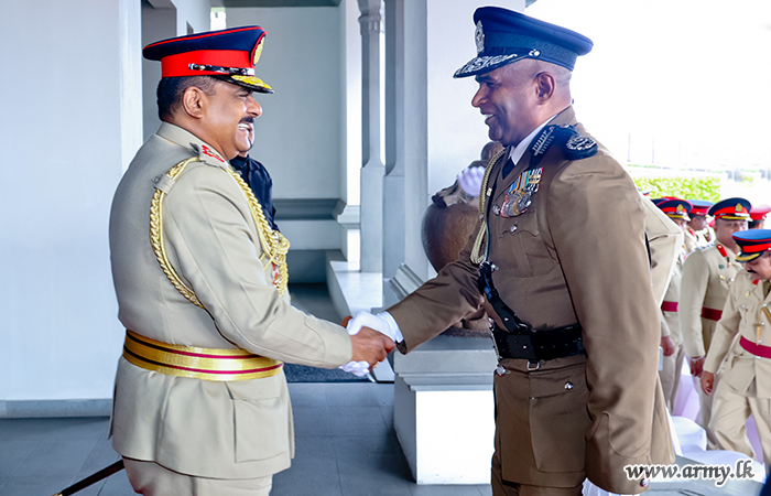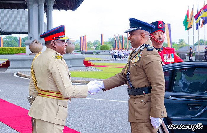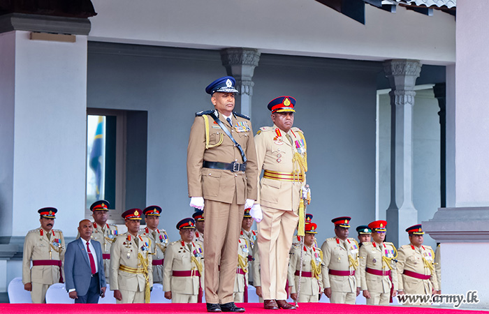 යුද්ධ හමුදා මූලස්ථාන පරිශ්රය වෙත පැමිණි පොලිස්පතිතුමන් වෙත යුද්ධ හමුදා භඨපිරිස් විසින් හමුදා සම්ප්රදායානුකූල කඳවුරු මුරයේ ගෞරවාචාරය පිරිනමන ලදී. අනතුරුව, යුද්ධ හමුදා විධායක ජෙනරාල් මේජර් ජෙනරල් කේ.ටී.පී. ද සිල්වා RSP ndu psc විසින් පොලිස්පතිතුමන්ව පිළිගැනීමෙන් පසුව ශ්රී ලංකා සංඥා බලකායේ භඨපිරිස් විසින් හමුදා සම්ප්රදායානුකූල සම්මාන මුරයේ ගෞරවාචාරය පිරිනමන ලදී.