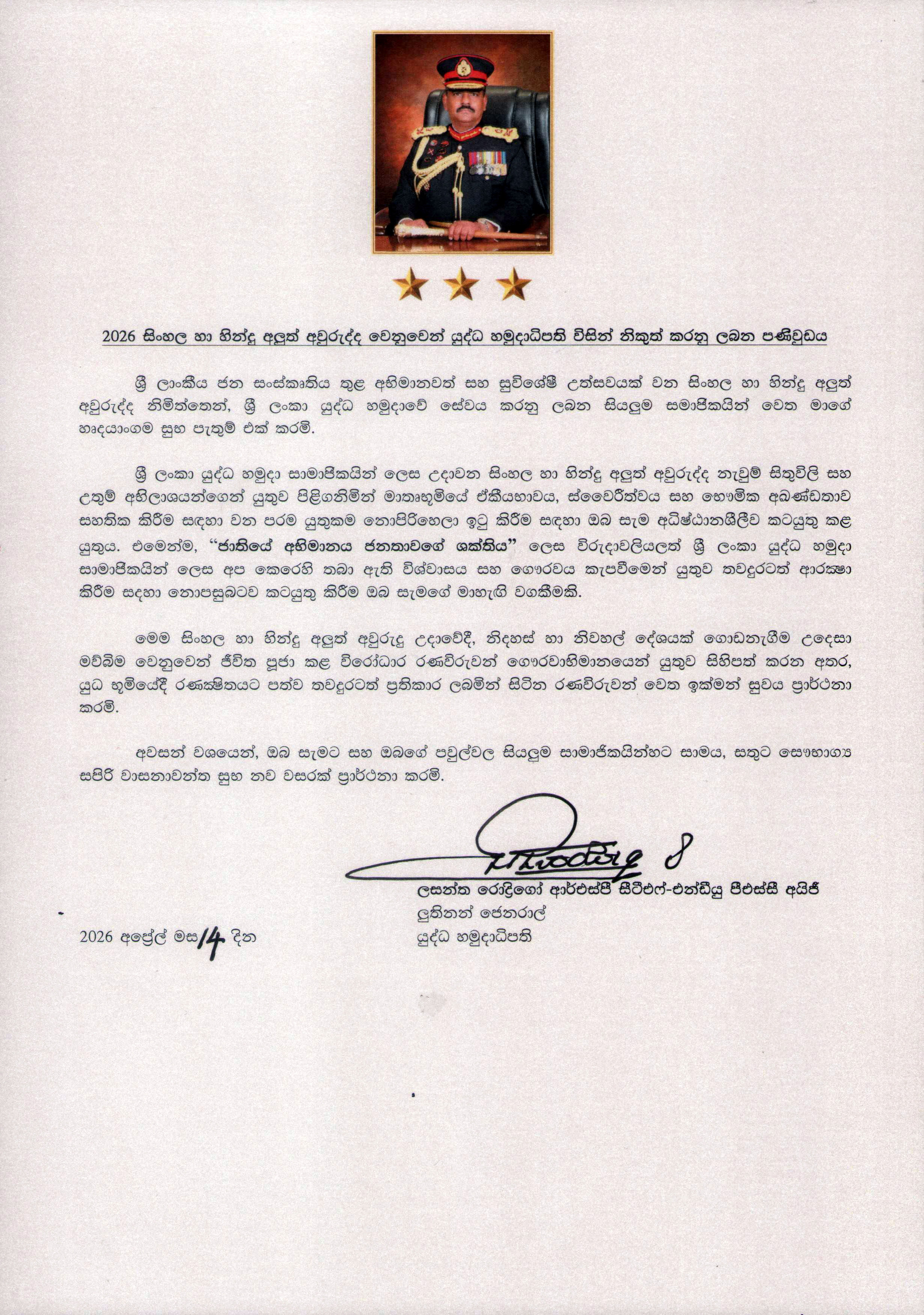 14th April 2026 යුද්ධ හමුදාධිපති ලුතිනන් ජෙනරල් ලසන්ත රොද්රිගෝ RSP ctf-ndu psc IG සිංහල හා දෙමළ අලුත් අවුරුදු පණිවිඩයක් නිකුත් කරමින් යුද්ධ හමුදාවේ සියලුම සාමාජිකයන්ට සෞභාග්යයමත් සුභ අලුත් අවුරුද්දක් වේවායි ප්රාර්ථනා කරයි! යුද්ධ හමුදාධිපතිතුමන්ගේ අලුත් අවුරුදු දින පණිවිඩය පහතින් දැක්වේ: