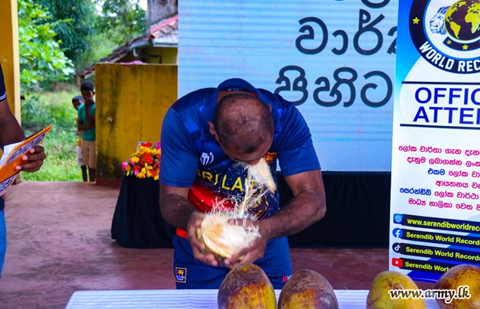 • විනාඩි තුනක් ඇතුළත දත් ආධාරයෙන් පොල් ගෙඩි දහයක් ලෙලි ගැසීම.