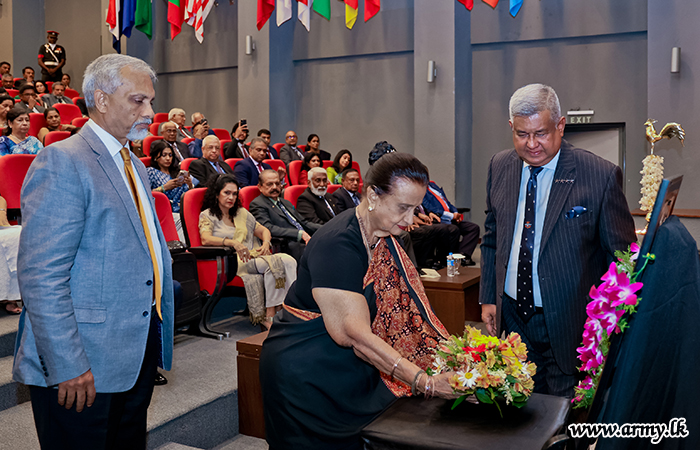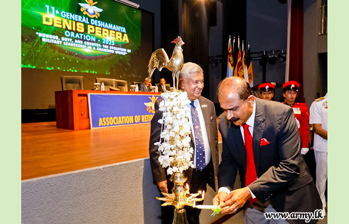 විශ්රාමික ධජ නිල නිලධාරින්ගේ සංගමයේ සභාපතිවරයා විසින් පිළිගැනීමේ කතාව පවත්වමින්, මෙම අවස්ථාවට ප්රධාන දේශකයා ලෙස පැමිණි යුද්ධ හමුදාධිපතිතුමන් පිළිබඳව හඳුන්වා දෙමින් එතුමන් වෙත ගෞරවනීය දේශන පදක්කම ප්රදානය කළේය. පසුව යුද්ධ හමුදාධිපතිතුමන් විසින් දේශනය පවත්වමින් දිවංගත ජෙනරල් ඩෙනිස් පෙරේරා ජ්යෙෂ්ඨ නිලධාරිගේ ආදර්ශමත් සේවය, නායකත්වය සහ ජාතියේ ආරක්ෂාව වෙනුවෙන් සිදුකල දායකත්වය පෙන්වා දෙන ලදී.