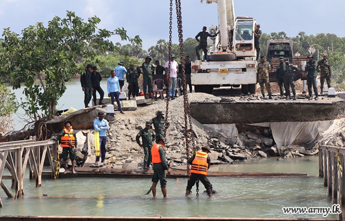ඒ අනුව, මාර්ග සංවර්ධන අධිකාරියේ ඉල්ලීමකට අනුව, දිට්වා සුළී කුණාටුව හේතුවෙන් දැඩි ලෙස හානියට පත්ව ජලයෙන් යටවී තිබූ නායාරු - කොකිලායි මාර්ගයේ පිහිටි 'කොම්පැක්ට් 200' වර්ගයේ පාලම් දෙකක් ප්රතිසංස්කරණය කිරීමේ කටයුතු සිදු කරන ලදි.