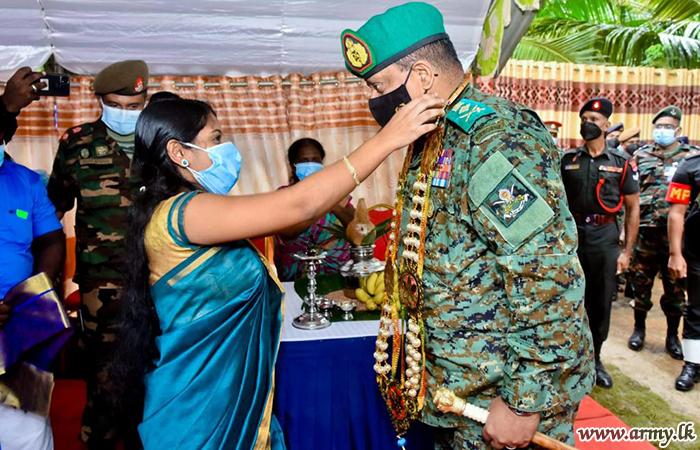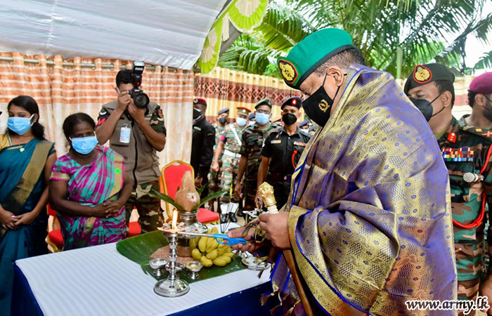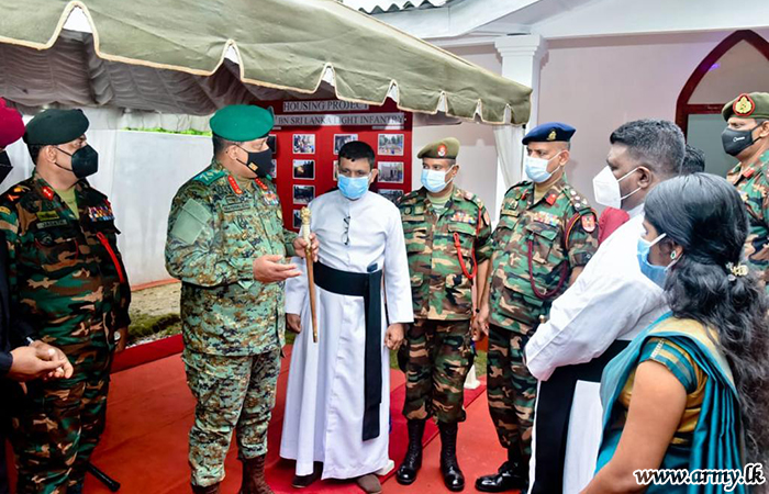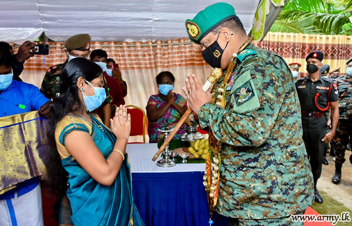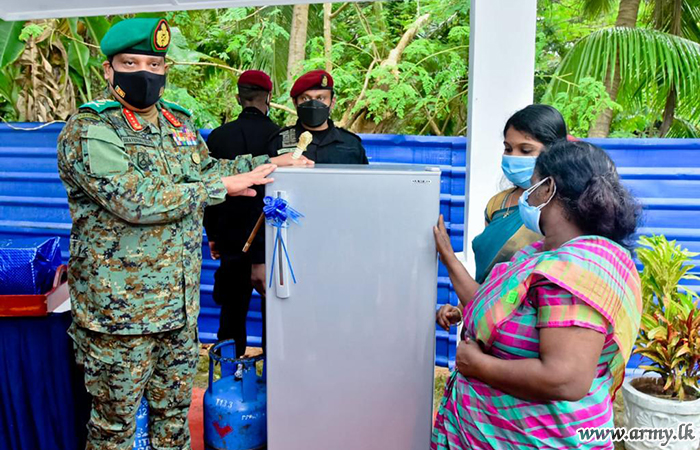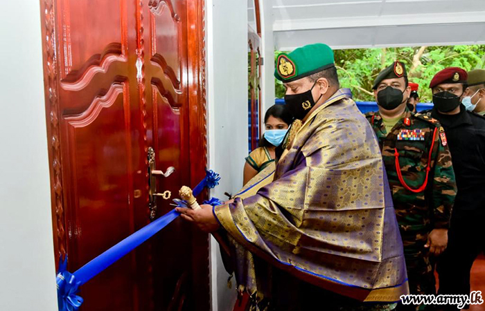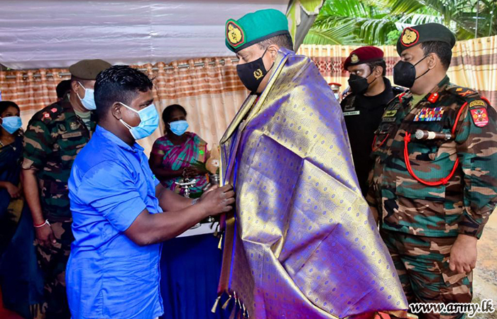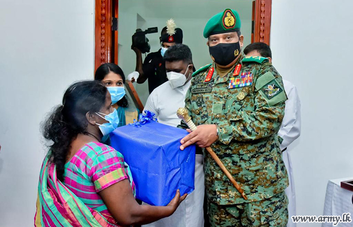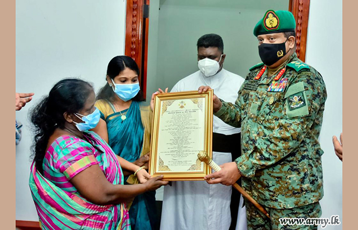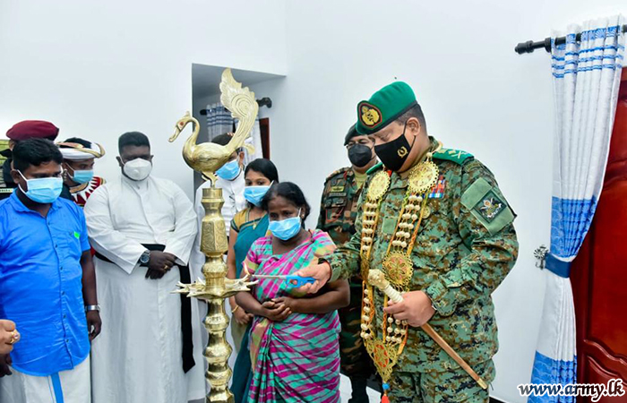 32 மற்றும் 20 வயதுடைய இரு பிள்ளைகளின் தாயான திருமதி மகேந்திரராசா அமிர்தமலர் என்னும் விதவை பெண்ணின் கணவன் 5 வருடங்களுக்கு முன்பாக புற்றுநோய் காரணமாக உயிரிழந்துவிட்ட நிலையில் வீடொன்று இல்லாமல் அல்லல்பட்டு வந்த குடும்பத்தின் நிலைமையை கருத்தில் கொண்டு, நிர்மாணிக்கப்பட்ட வீட்டின் பெயர் பலகையை திறைநீக்கம் செய்து வைத்த ஜெனரல் ஷவேந்திர சில்வா அவர்கள் வீட்டின் சாவியையும் பயனாளிகளுக்கு கையளித்தார்.