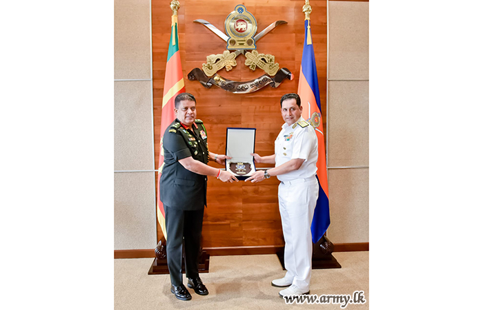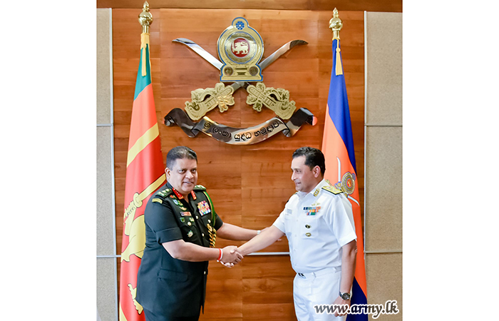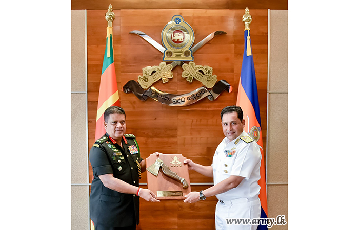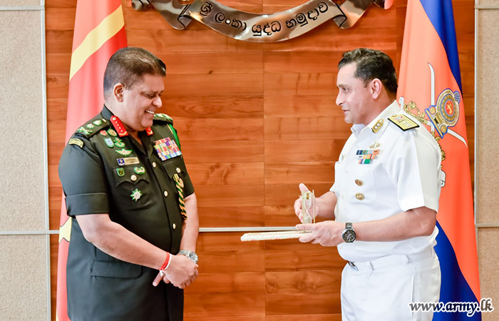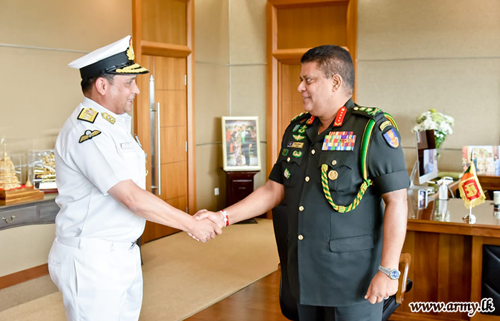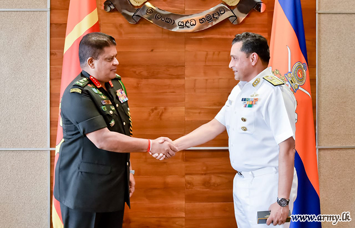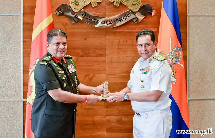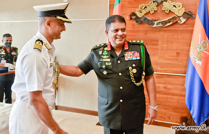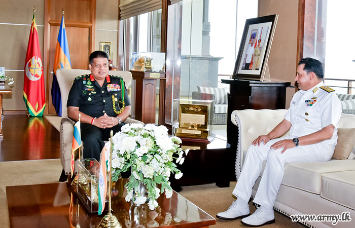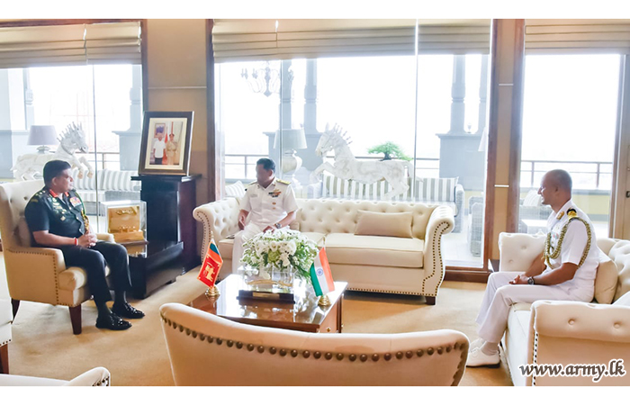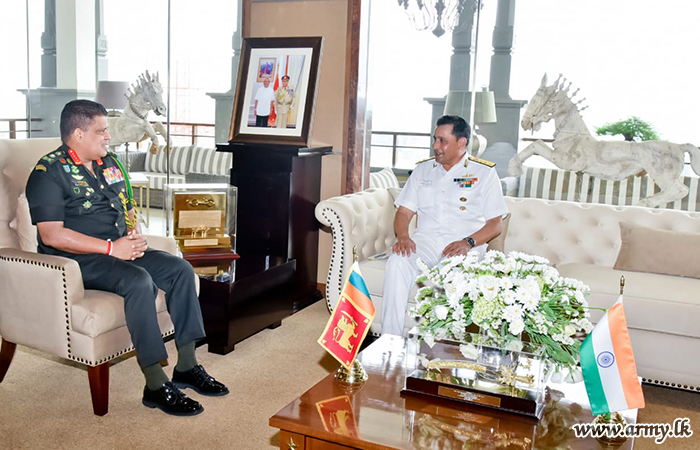 தற்போது கொழும்பில் நங்கூரமிட்டுள்ள இந்தியா கடற்படையின் நவீன அந்தரங்க வழிகாட்டும் ஏவுகணை அழிப்புக் கப்பலான ஐ.என்.எஸ் சென்னை கப்பலின் மேற்கு கடற்படைத்தளத்தின் தளபதி ரியர் அட்மிரல் சமீர் சக்சேனா, என்எம் அவர்கள் இன்று காலை (10) பாதுகாப்புப் பதவி நிலைப் பிரதானியும் இராணுவத் தளபதியுமான ஜெனரல் ஷவேந்திர சில்வா அவர்களை மரியாதை செலுத்தும் விதமாக இராணுவத் தலைமையகத்தில் சந்தித்தார்.