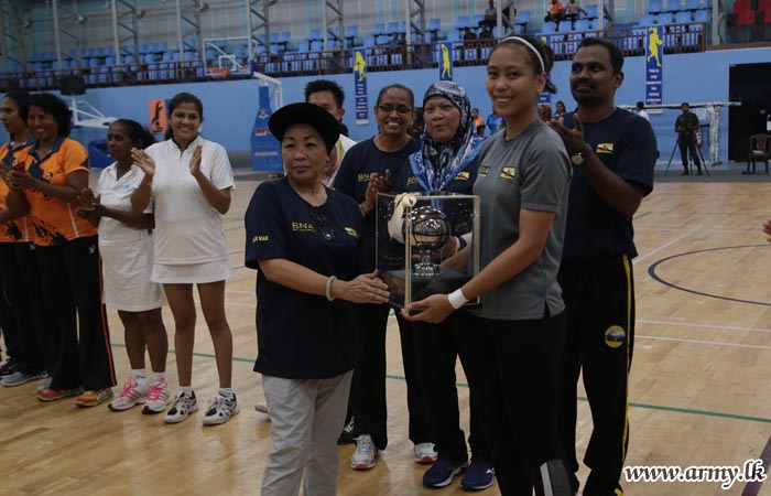 பெருமளவு பார்வையாளர்களுக்கு மத்தியில் இரண்டு அணியினருக்கும் இடையில் நடைபெற்ற போட்டியில் (58) புள்ளிகள் புருனே தேசிய அணி பெற்றுக்கொண்டதுடன் இராணுவ மகளீர் படையணி (50) புள்ளிகள் பெற்றது.