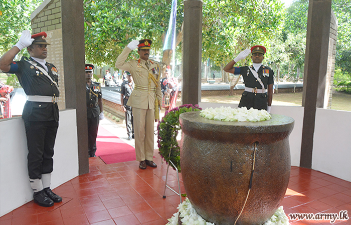 அதனை தொடர்ந்து உயிர் நீத்த படை வீரர்களின் நினைவு தூபிக்கு மேஜர் ஜெனரல் ஜகத் குணவர்தன அவர்கள் மலர்வலயம் வைத்து மரியாதை செலுத்தினார். அதன் பின்னர், மேஜர் ஜெனரல் ஜகத் குணவர்தன அவர்கள் அனைத்து படையினர்களுடன் தேநீர் விருந்துபசாரத்திலும் கலந்துகொண்டார்.