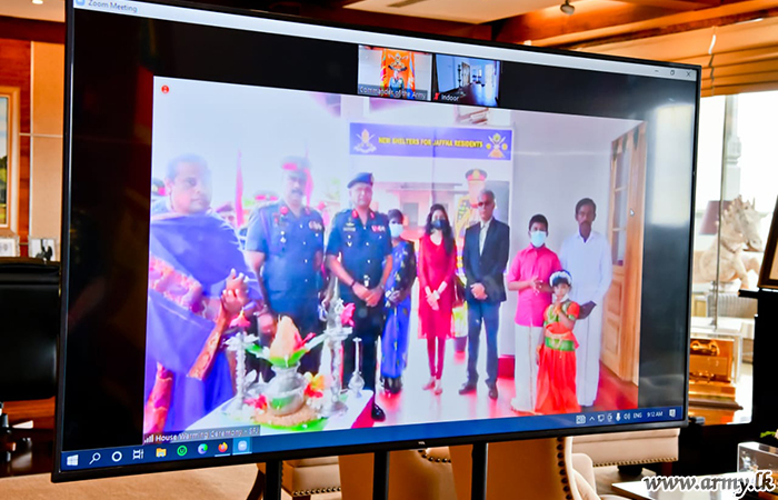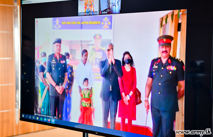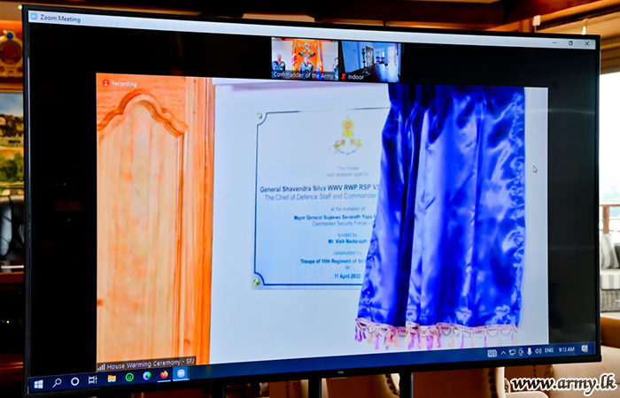 திங்கட்கிழமை (11) இத்திட்டத்தின் முன்னோடியான, பாதுகாப்பு பதவி நிலைப் பிரதானியும் இராணுவத் தளபதியுமான ஜெனரல் ஷவேந்திர சில்வா, அவர்கள் இராணுவத் தலைமையகத்திலுள்ள இராணுவத் தளபதியின் அலுவலகத்திலிருந்து ஜூம் தொழில்நுட்பத்தின் ஊடாக திரு ராசவல்லன் தபோரூபனுக்கு மைலடியில் வீட்டினை கையளிக்கும் நிகழ்வில் இணைந்து கொண்டார். மேலும் ஒளிமயமான எதிர்காலத்திற்கு தனது வாழ்த்துக்களை தெரிவித்ததோடு சமய நிகழ்வுகள் இடம்பெற்ற பின்னர் வீடு கையளிக்கும் வன்னம் திறப்பு பலகை ஒன்றும் திறந்து வைக்கப்பட்டது.
