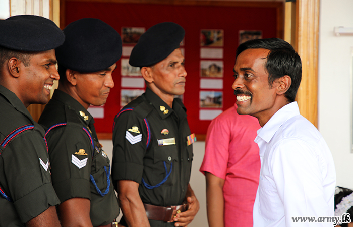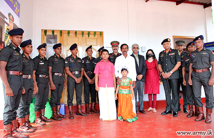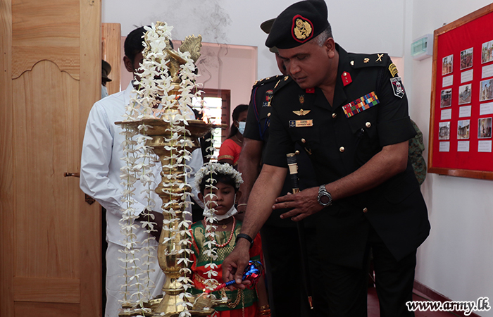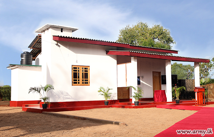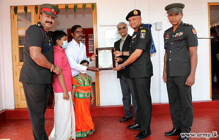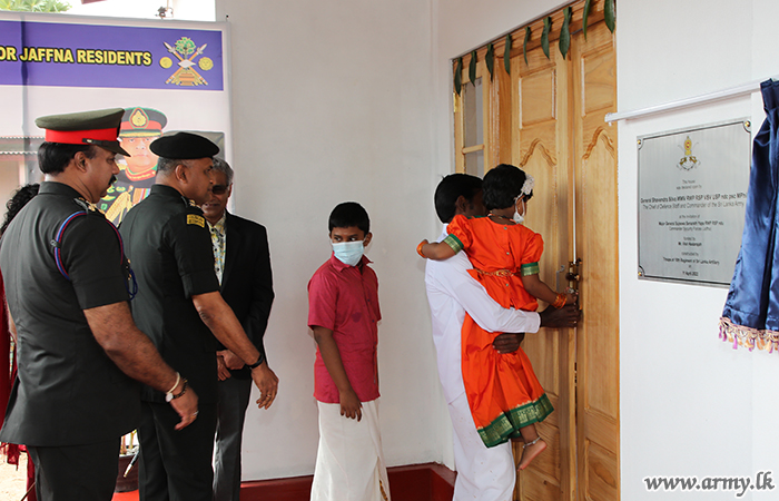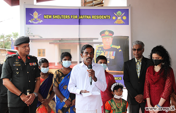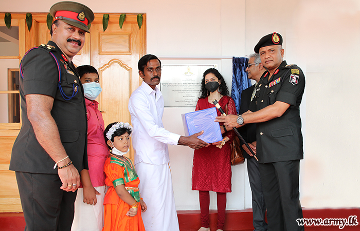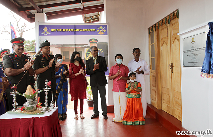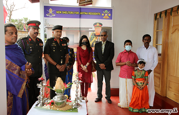 யாழ். பாதுகாப்புப் படைத் தலைமையக தளபதி மேஜர் ஜெனரல் சுஜீவ செனரத் யாப்பா மற்றும் அனுசரணையாளரான திரு விஷ் நடராஜா அவரது துணைவியார் திருமதி நடராஜா ஆகியோருடன் இணைந்து, இந்து மத சடங்குகள் மற்றும் சடங்குகள் செய்யப்பட்ட பிறகு புதிதாக நிர்மாணிக்கப்பட்ட வீட்டின் சாவியை முன்னாள் போராளியிடம் கையளித்தார்.