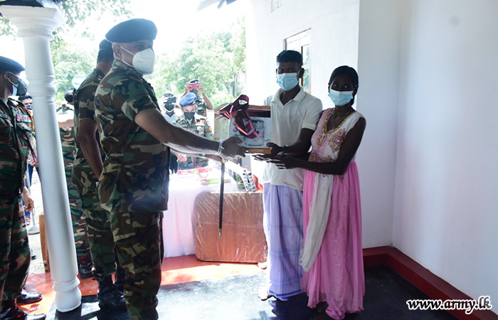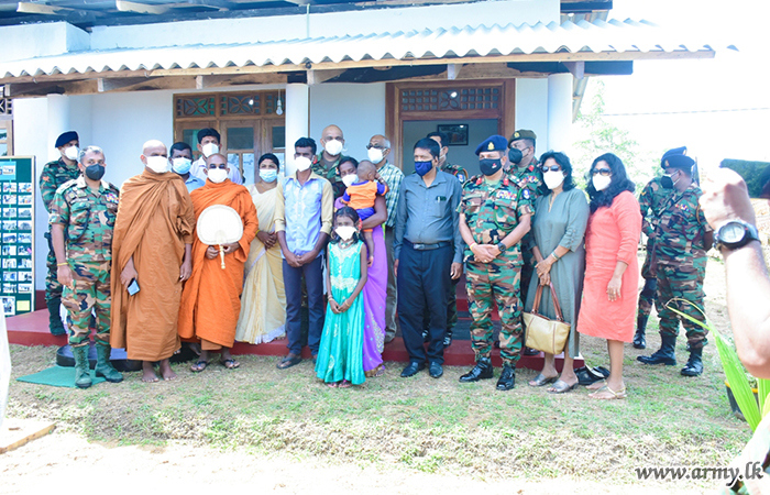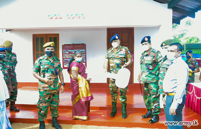 முல்லைத்தீவு பாதுகாப்புப் படைத் தவைமையக தளபதி மேஜர் ஜெனரல் சிசிர பிலபிட்டியவின் அறிவுறுத்தலின் படி செவ்வாய்க்கிழமை (12) 64 வது படைபிரிவினால் நிர்மாணிக்கப்பட்ட வீடு கையளிப்பு விழாவில் முல்லைத்தீவு பாதுகாப்புப் படைத் தளபதி பிரதம அதிதியாக கலந்து கொண்டார் 54 மண்ணங்கண்டல் கிராம சேவகர் பிரிவின் கிரணமடு மண்ணங்கண்டல் பிரதேசத்தில் வசிக்கும் திருமதி ராமச்சந்திரன் மதிவதினி என்பவருக்கான இந்த புதிய வீட்டை நிர்மாணிப்பதற்கான நன்கொடையாக ரூ .4 லட்சம் பௌத்த துறவிகளான வண. வெல்கமுவ சாந்தபோதி தேரர் மற்றும் வண. பிலியந்தல அமிதகோஷ தேரர் ஆகியோரால் வழங்கப்பட்டது. இந்த திட்டத்திற்கு தொழில்நுட்ப நிபுணத்துவத்தையும் மனிதவளத்தையும் 641 வது பிரிகேட்டின் 14 வது இலங்கை சிங்கப் படையனினர் வழங்கினர்.
