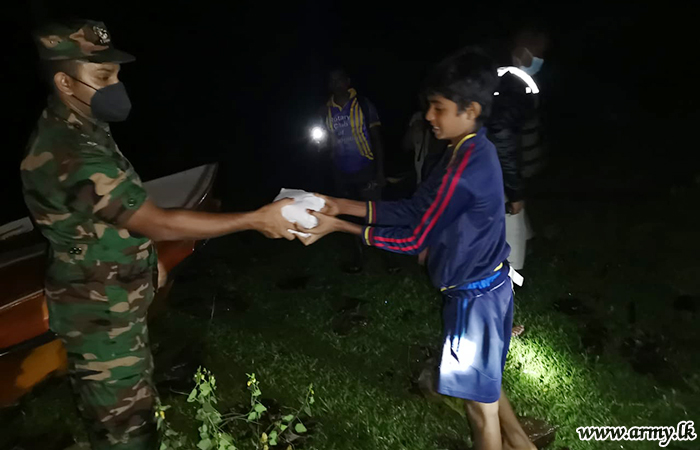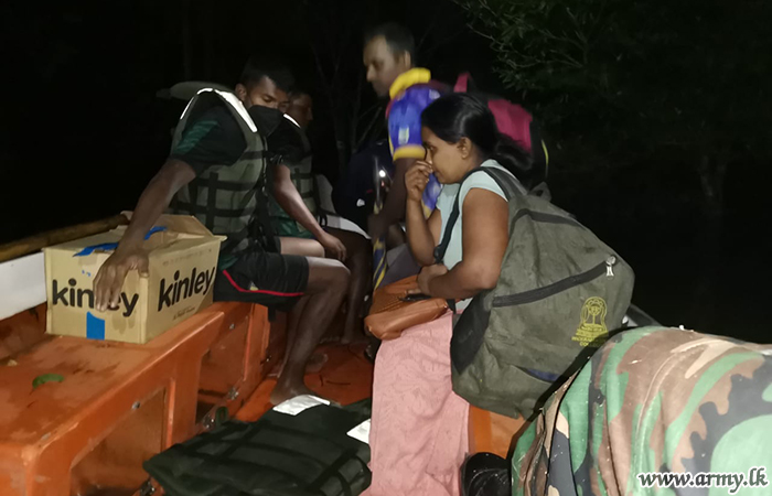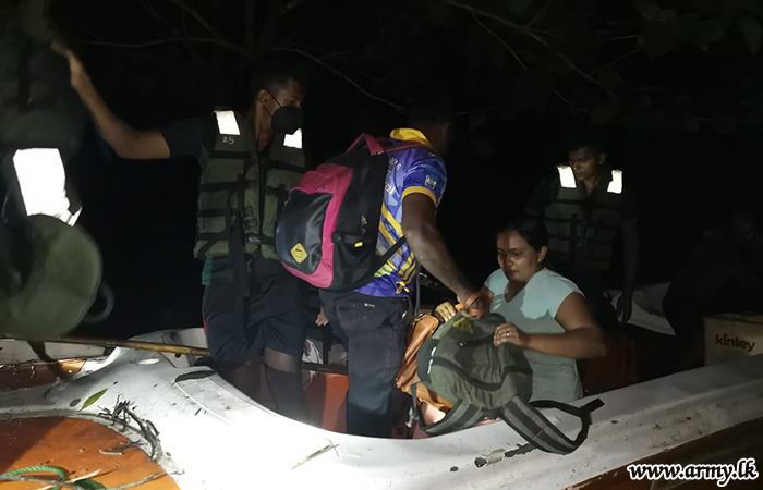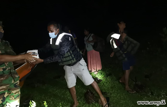 இராணுவ படகுகளின் உதவியுடன் அவர்களை பாதுகாப்பான இடங்களுக்கு கொண்டு சேர்த்த படையினர் அவர்களுக்கான சமைத்த இரவு மற்றும் மதிய உணவு பொதிகளையும் வழங்கினர்.