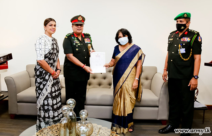 நன்கொடையாளர், ஹோமாகம, ரொமியல் மாவத்தையில் அமைந்துள்ள தனது சொத்து தொடர்பான ஆவணங்களை, ஜெனரல் ஷவேந்திர சில்வா மற்றும் இராணுவ சேவை வனிதையர் பிரிவின் தலைவி திருமதி சுஜீவா நெல்சன் ஆகியோரிடம் கையளித்தார். திருமதி நெல்சன் திருமதி லியனகே அவர்களின் சிந்தனைக்கு நன்றி தெரிவித்ததுடன், போர்வீரர்கள் மற்றும் அவர்களது குடும்ப உறுப்பினர்களின் நலனை மேம்படுத்தும் வகையில், சொத்து நிச்சயமாக சிறந்த நோக்கத்திற்காக பயன்படுத்தப்படும் என்று உறுதியளித்தார்.