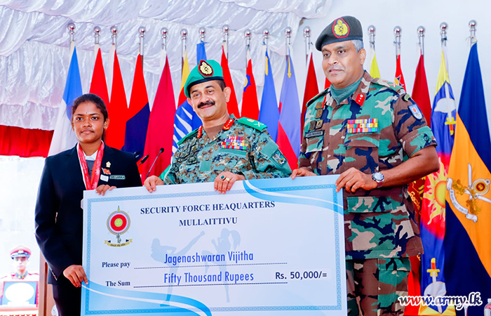 மேலும், 2022ஆம் ஆண்டுக்கான இந்திய குத்துச் சண்டை போட்டியில் வெள்ளிப் பதக்கம் வென்ற கிளிநொச்சி மத்திய கல்லூரியைச் சேர்ந்த ஜெகனேஸ்வரம் விஜிதா மற்றும் 2022ஆம் ஆண்டு பாகிஸ்தான் குத்துச் சண்டை போட்டியில் தங்கப் பதக்கம் வென்ற புதுக்குடியிருப்பு வித்தியாலயத்தைச் சேர்ந்த குத்துச்சண்டை வீராங்கனை கணேஷ் இந்திகாதேவி ஆகியோருக்கு ரூ.50,000 காசோலை வழங்கப்பட்டது. மேலும் எதிர்கால சாதனைகளுக்காக அவர்களை ஊக்குவிக்கும் முயற்சியாக இருவரையும் தளபதி வாழ்த்தியதுடன், அவர்களுடன் ஓரிரு கருத்துக்களையும் பகிர்ந்து கொண்டார்.