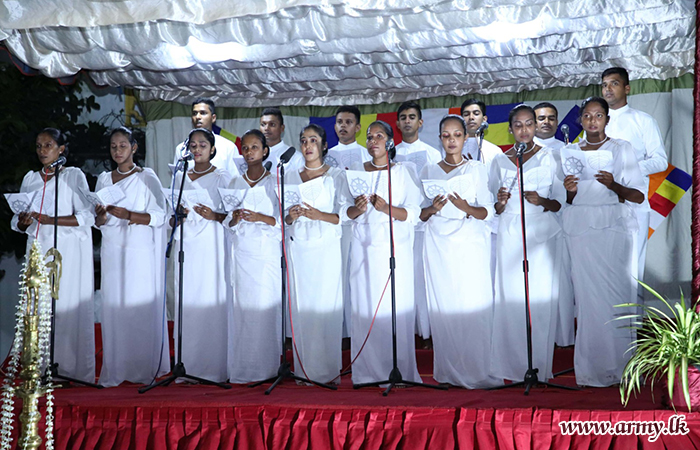 மாலையில், கடற்படை, விமானப்படை மற்றும் பொலிஸ் ஆகியவற்றில் இருந்து தலா ஒரு குழுவும் இராணுவத்தின் இரு அணிகள் என ஒரே நேரத்தில் ஐந்து வெவ்வேறு இடங்களில் “பக்தி பாடல்” நிகழ்ச்சி நடத்தப்பட்டது. இறுதியில், ஐந்து குழுக்களும் யாழ்ப்பாணம் நாக விகாரையில் ஒன்றுகூடி, இராணுவம் மற்றும் பொதுமக்களுக்கு முப்படையினரும் பொலிஸாரும் இணைந்த ‘பக்தி பாடல்’ அமர்வை நடத்தினர். பெண் சிப்பாய்கள் உட்பட படையினர் புத்தரின் பிறப்பு, ஞானம் பெறல், பரிநிர்வாணத்தை குறிக்கும் பக்தி பாடல்களை பாடினர்.