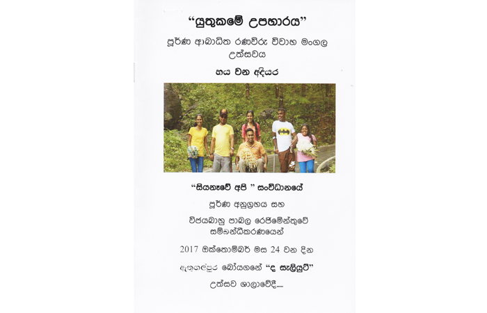 சியநெவே அபி எனும் கம்பஹா சியனே கோரளய எனும் கழகத்தைச் சேர்ந்த குழுவினர் யுத்தத்தின் போது எல் ரி ரீ ஈ யினருடன் போரிட்டு அங்கவீனமுற்ற படை வீரர்களுக்கான திருமண நிகழ்வுகளை தமது சொந்த செலவில்......
