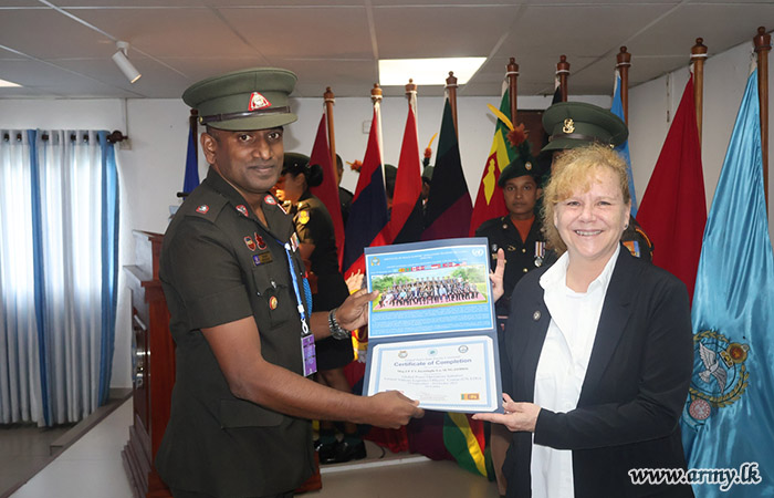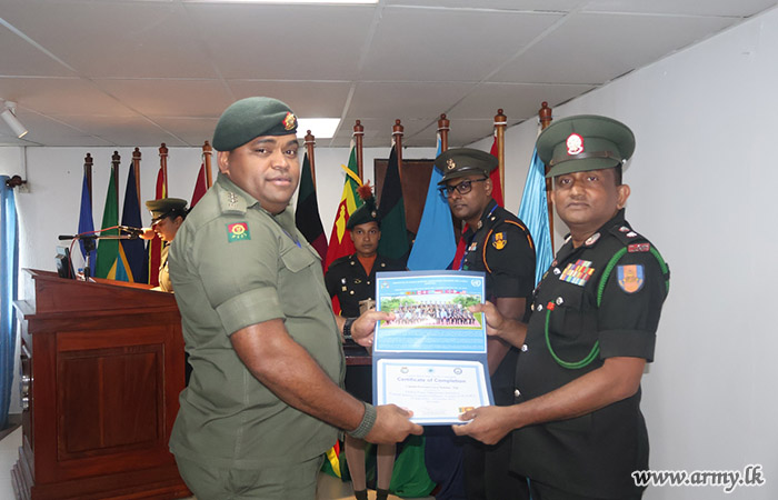 இலங்கை அமைதிகாக்கும் பணிக்கான நடவடிக்கை பயிற்சி நிறுவனத்தின் தலைமை பயிற்றுவிப்பாளரான கெமுனு ஹேவா படையணியின் லெப்டினன் கேணல் பீ.எஸ்.டி டி அல்விஸ் ஆர்எஸ்பீ யூஎஸ்பீ பீஎஸ்சீ அவர்கள் இந்நிகழ்வில் பிரதம விருந்தினராகக் கலந்து கொண்டு பங்கேற்பாளர்களுக்கு சான்றிதழ்களை வழங்கினார். இலங்கை அமைதிகாக்கும் பணிக்கான நடவடிக்கை பயிற்சி நிறுவனத்தின் சிரேஷ்ட அதிகாரிகள், அதிகாரிகள் மற்றும் பயிற்றுவிப்பாளர்கள் இந்நிகழ்வில் கலந்து கொண்டனர்.