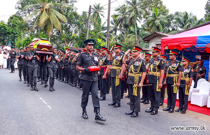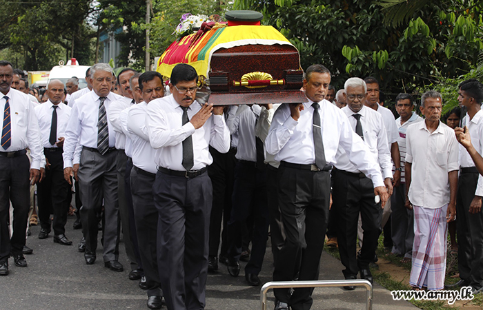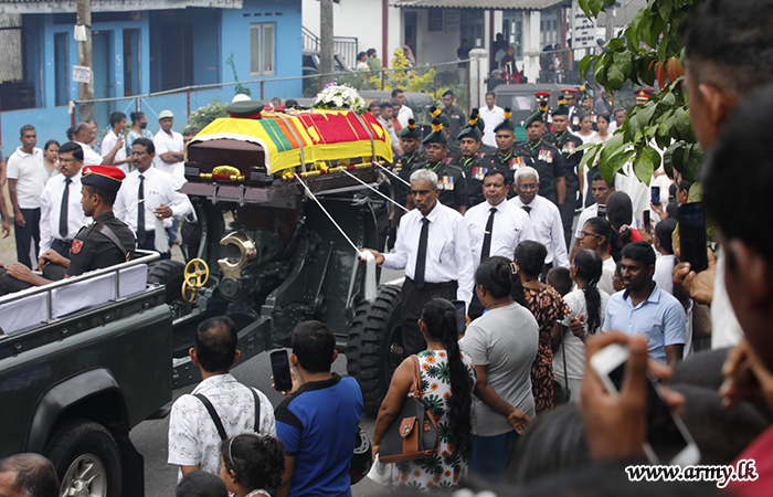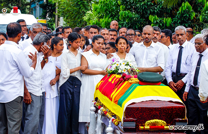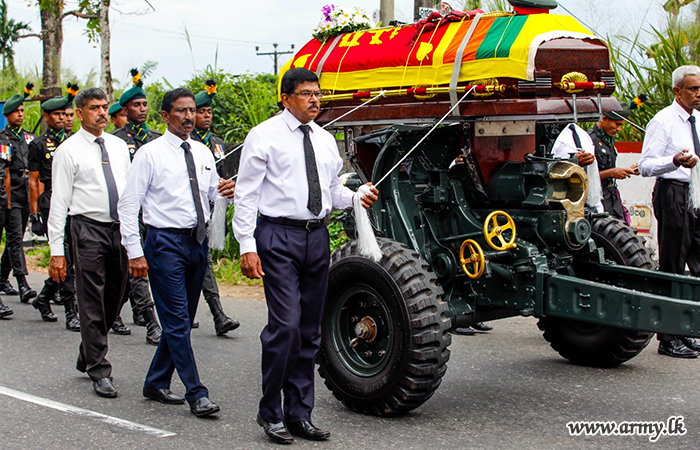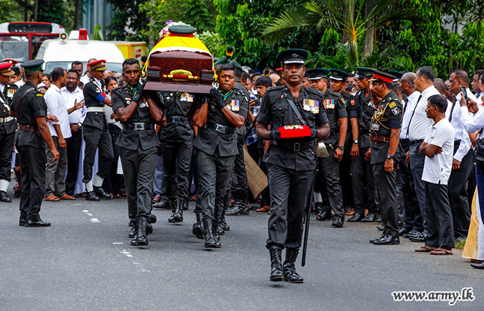 இறுதி ஊர்வலம் மயானத்தின் பிரதான நுழைவாயிலை அடைந்ததும், சிரேஷ்ட அதிகாரிகள் பிரதிநிதிகள் குழு பூதவுடலை தாங்கிய பேழையை முறையாக பெற்றுக்கொண்டதுடன், இராணுவ அதிகாரிகள், குடும்ப உறுப்பினர்களுடன் பேழைக்கு பின்னால் அணிவகுத்து சென்றனர்.