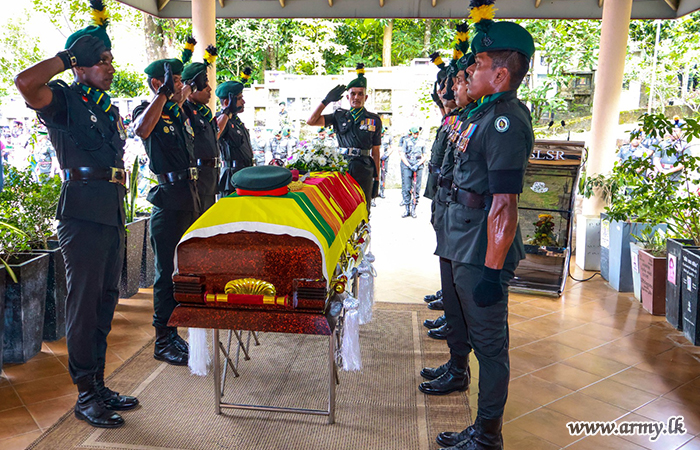இராணுவ சம்பிரதாயத்திற்கு அமைய படையினர், தேசியக் கொடியால் போர்த்தப்பட்ட பூதவுடலை தாங்கிய பேழை பீரங்கி வண்டியில் வைப்பதற்கு முன்பு மயானத்தின் நுழைவாயிலில் ஆயுத மரியாதை செலுத்தினர்.