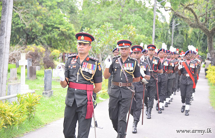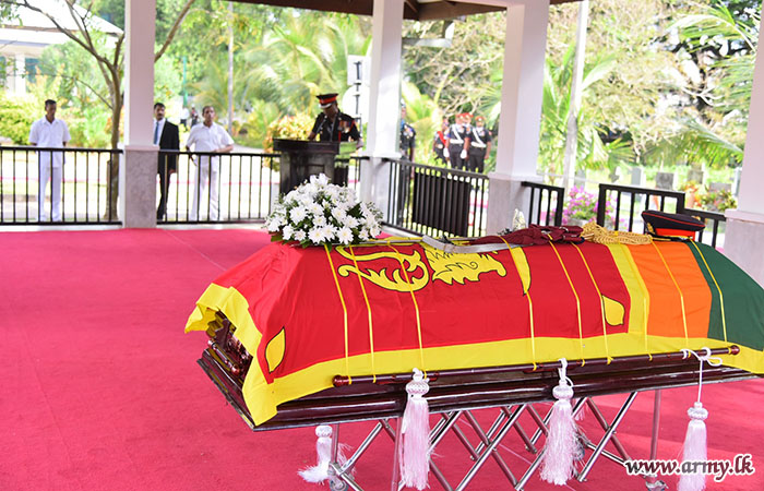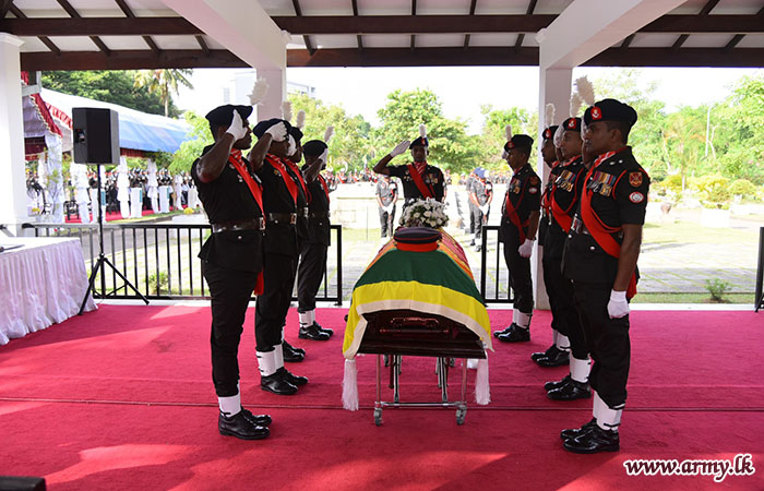 இராணுவ சம்பிரதாயத்திற்கு அமைய இலங்கை இலேசாயுத காலாட் படையணி படையினர், தேசியக் கொடியால் போர்த்தப்பட்ட பூதவுடலை தாங்கிய பேழையின் பின்னால் வைப்பதற்கு முன்பு மயானத்தின் நுழைவாயிலில் ஆயுத மரியாதை வழங்கினர். இறுதி ஊர்வலம் மயானத்தின் பிரதான நுழைவாயிலை அடைந்ததும், இராணுவத்தினர்,குடும்ப உறுப்பினர்களுடன் பேழையினை பின்னால் அணிவகுத்து சென்றனர்.