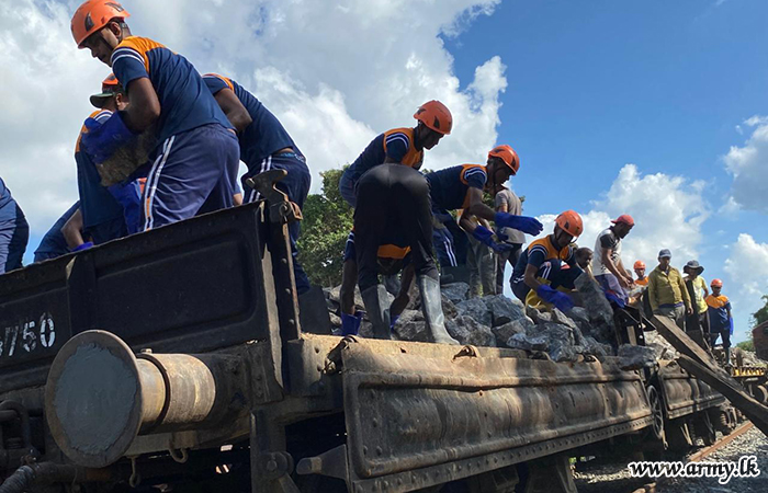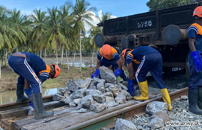 கிழக்கு பாதுகாப்புப் படைத் தலைமையகத்தின் படையினர் சீரற்ற வானிலையால் கடுமையாக சேதமடைந்த கொழும்பு-மட்டக்களப்பு புகையிரத பாதையின், மனம்பிட்டி பிரதேசத்தில் பழுதுபார்க்கும் பணிகளை மேற்கொண்டு வருகின்றனர்.