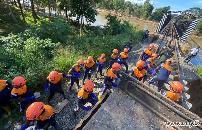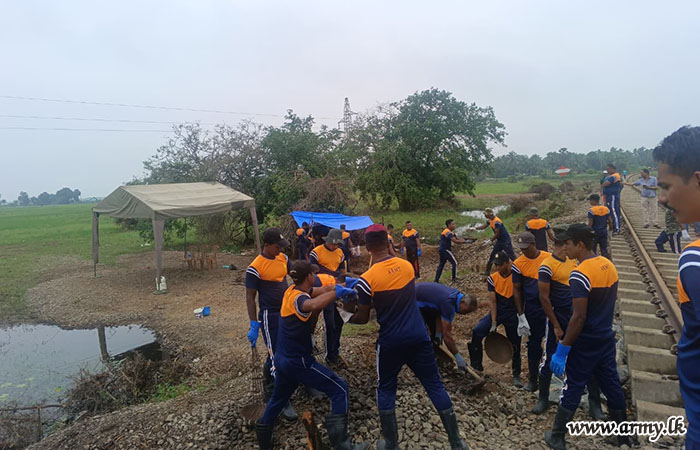 21 வது காலாட் படைப்பிரிவின் கீழ் இயங்கும் 2 வது (தொ) விஜயபாகு காலாட் படையணி படையினர், செட்டிகுளம் பகுதியில் உள்ள செட்டிகுளம் மற்றும் முஹந்தன்குளம் இடையே 251 கி.மீ முதல் 250 கி.மீ மைல்கல் வரையிலான ரயில் பாதையில் இடிபாடுகளை நிரப்பும் பணியில் ஈடுபட்டுள்ளனர். மேலும், 279 கி.மீ - 280 கி.மீ மைல்கல் வரையிலான ரயில் பாதையை புனரமைப்பதில் உதவுவதற்காக, 54 வது காலாட் படைப்பிரிவின் 8 வது விஜயபாகு காலாட் படையணி படையினர், 2025 டிசம்பர் 23 அன்று பணியமர்த்தப்பட்டனர். இந்த முயற்சிகள் சாதாரண புகையிரத போக்குவரத்து நடவடிக்கைகளை மீட்டெடுப்பதையும், பாதிக்கப்பட்ட பகுதிகளில் புகையிரத போக்குவரத்தின் பாதுகாப்பு மற்றும் நம்பகத்தன்மையை உறுதி செய்வதையும் நோக்கமாகக் கொண்டுள்ளன. மேலும், வீதி அபிவிருத்தி அதிகாரசபையின் வேண்டுகோளின் பேரில், 59 வது காலாட் படைப்பிரிவின் படையினர் சேதமடைந்த நாயாறு பாலத்தை புனரமைப்பதில் உதவி செய்து வருகின்றன. பாலத்தின் புதுப்பித்தல் பணிகள் தற்போது நடைபெற்று வருகின்றமை குறிப்பிடதக்கதாகும்.